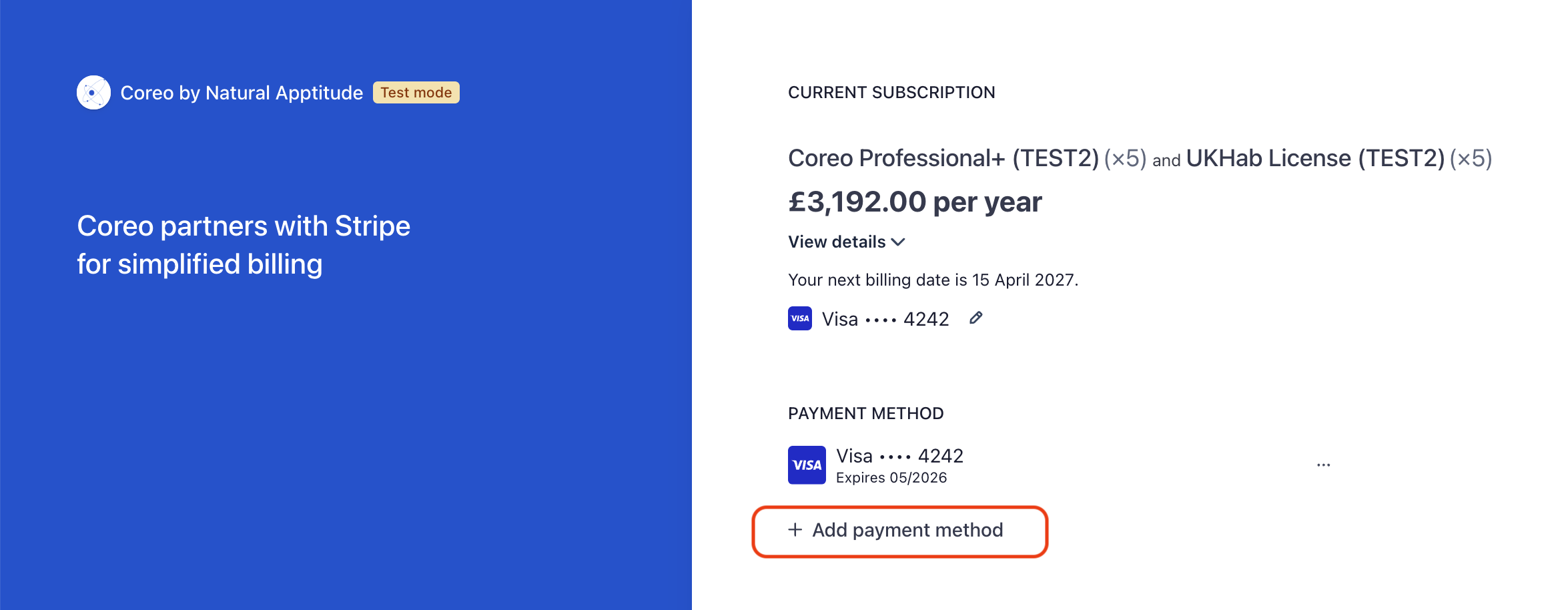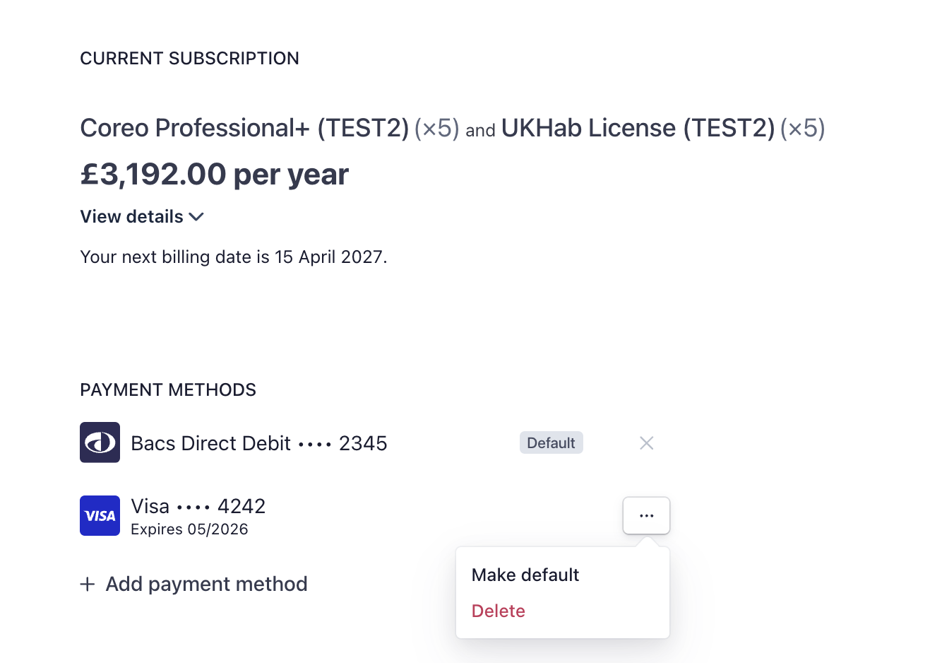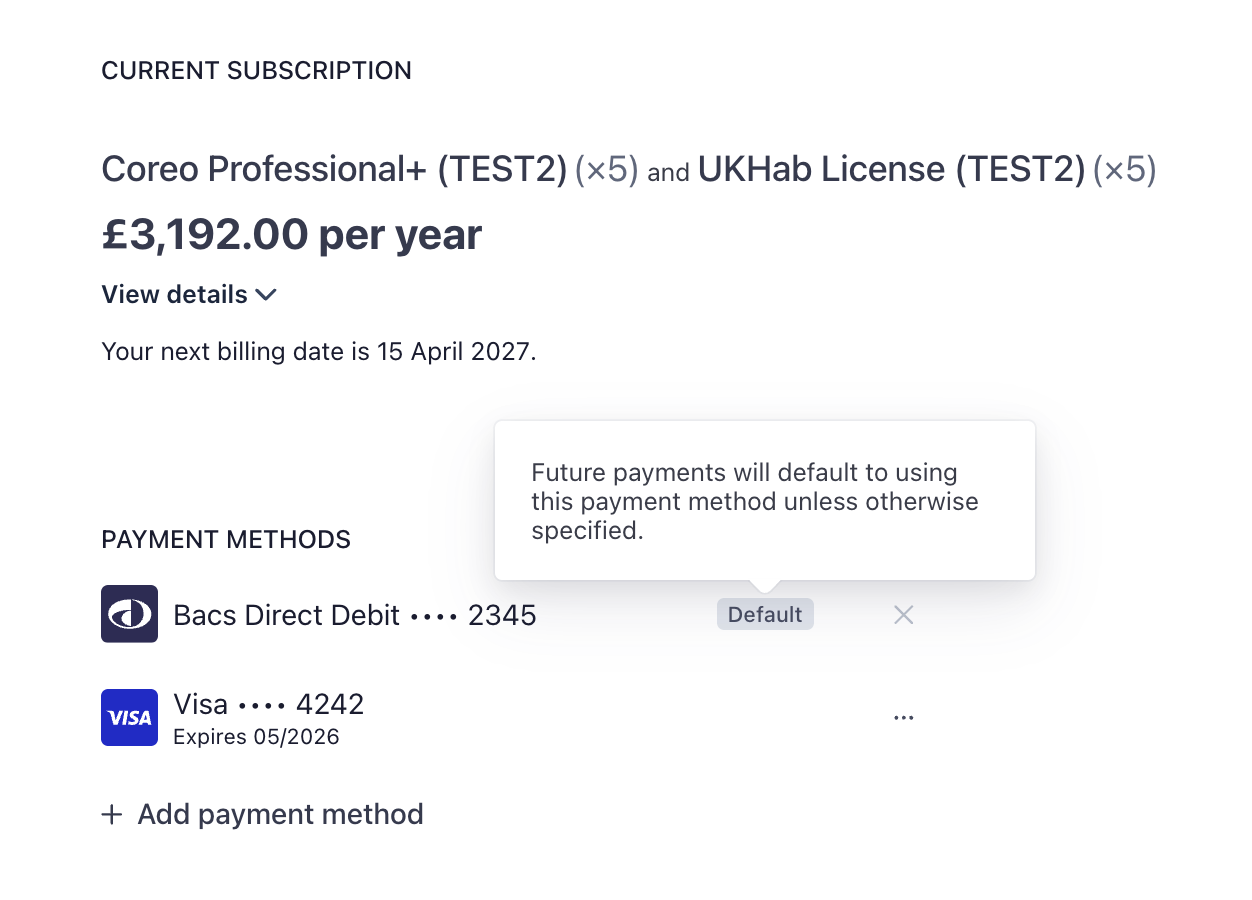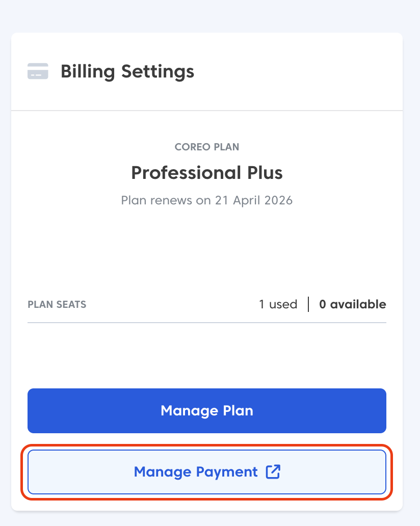 If you want to change your payment method for your Coreo subscription, you can add a new one.