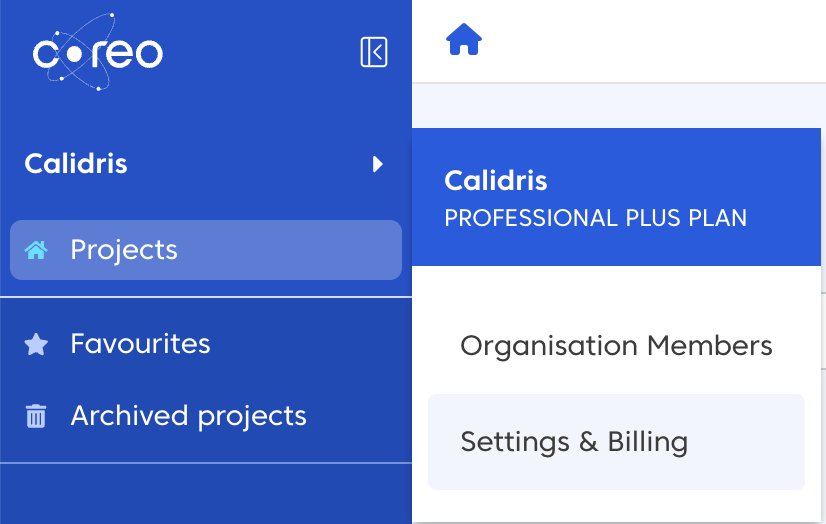 Select your organisation name in the side panel and then select Settings & Billing