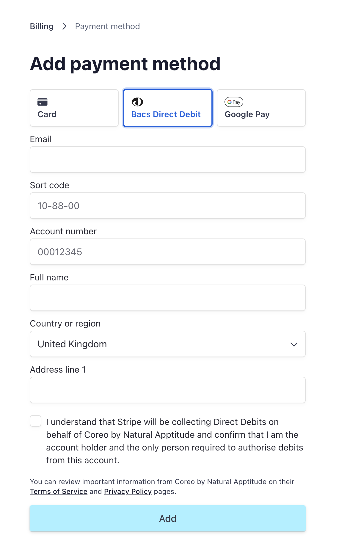 Next, choose which payment method to add and fill out the relevant details: