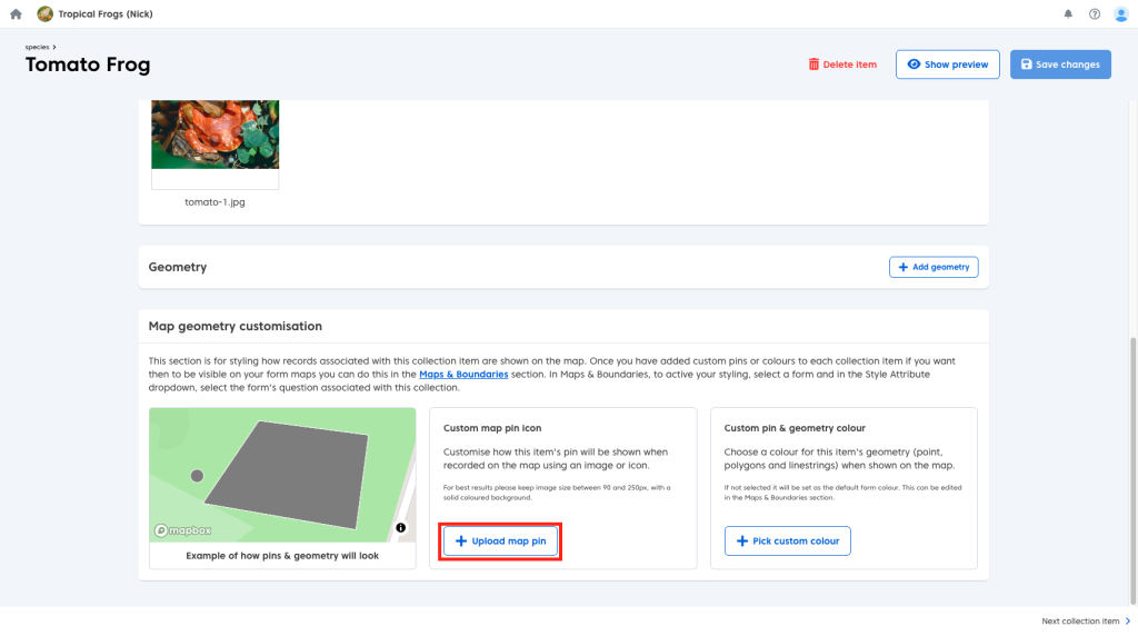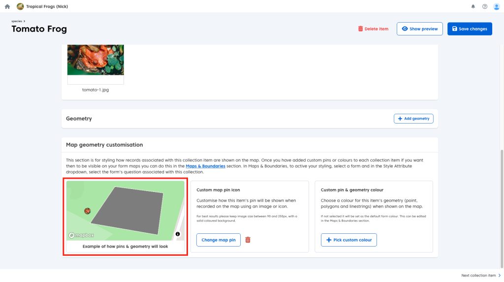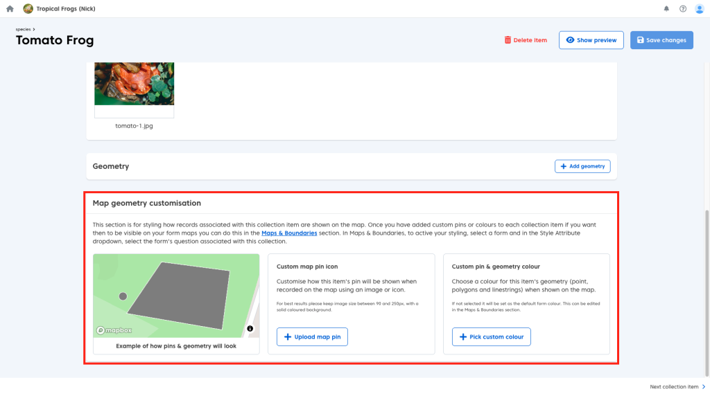 You will now see the ‘Map Geometry Customisation’ options. This is where you can add the styling to your collection item.