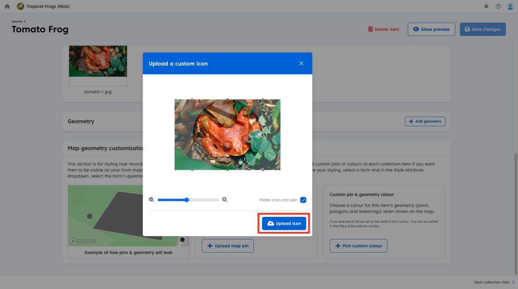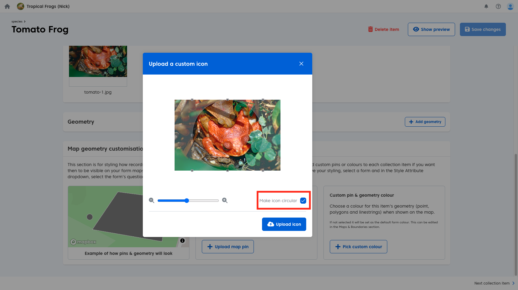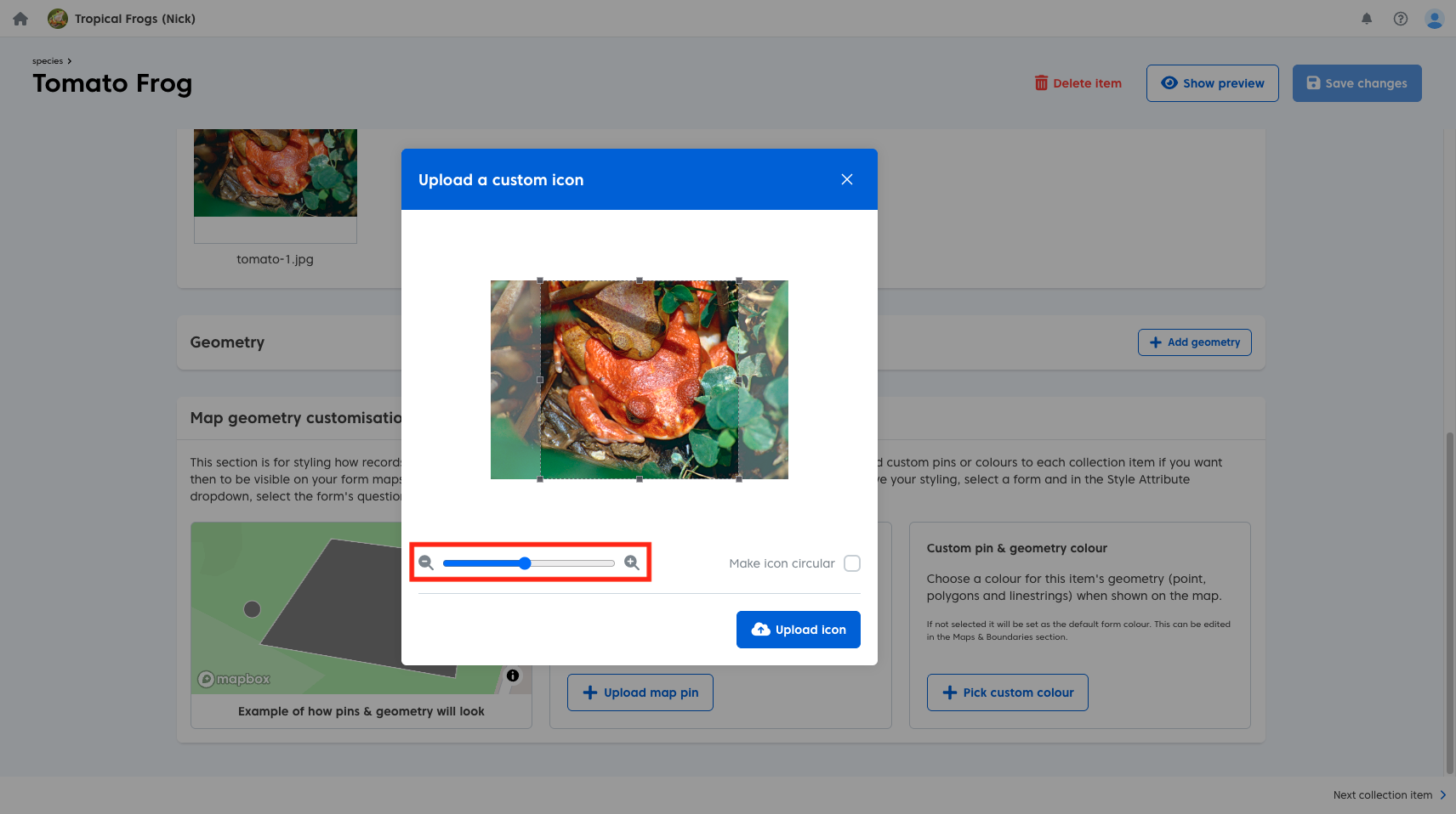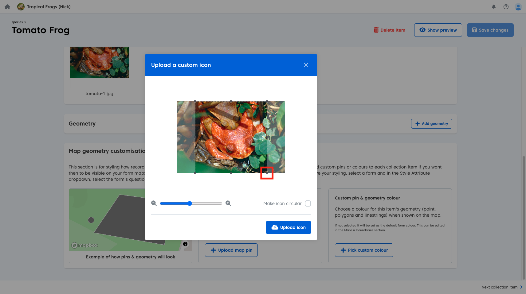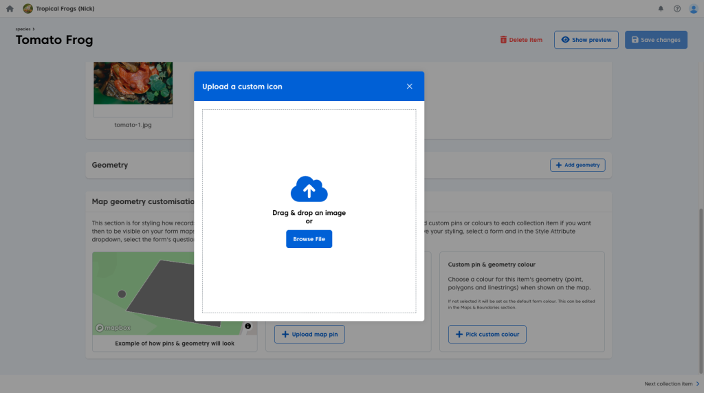 There are two customisation options available. The first, enables you to replace your point geometry associated with the item with an icon of your choice. To add a custom icon: