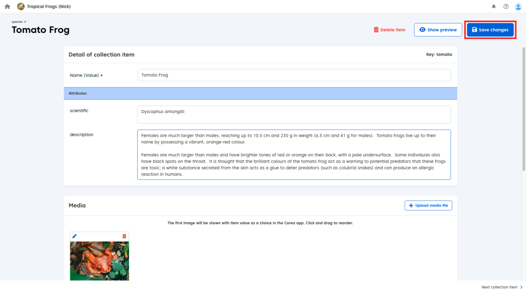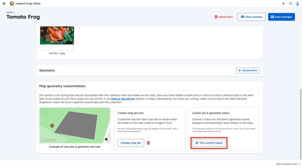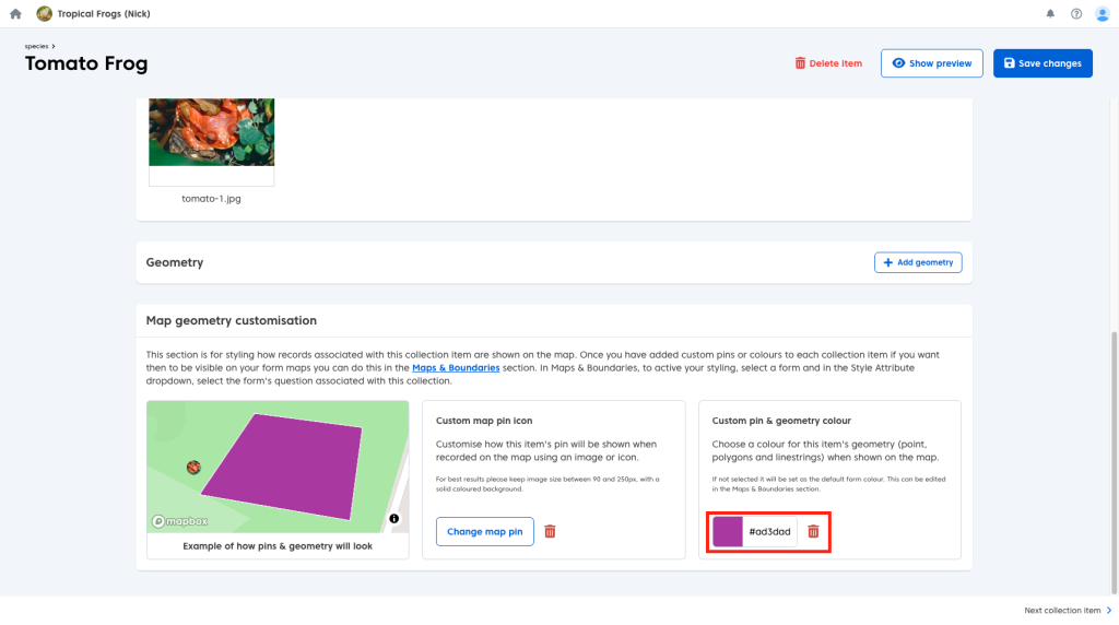 You can also give any polygons or point geometry associated with the chosen collection item a custom colour (thereby differentiating it from the others). To do so: