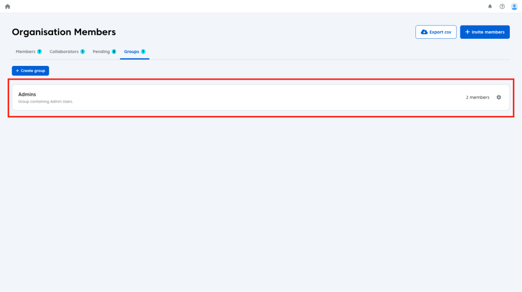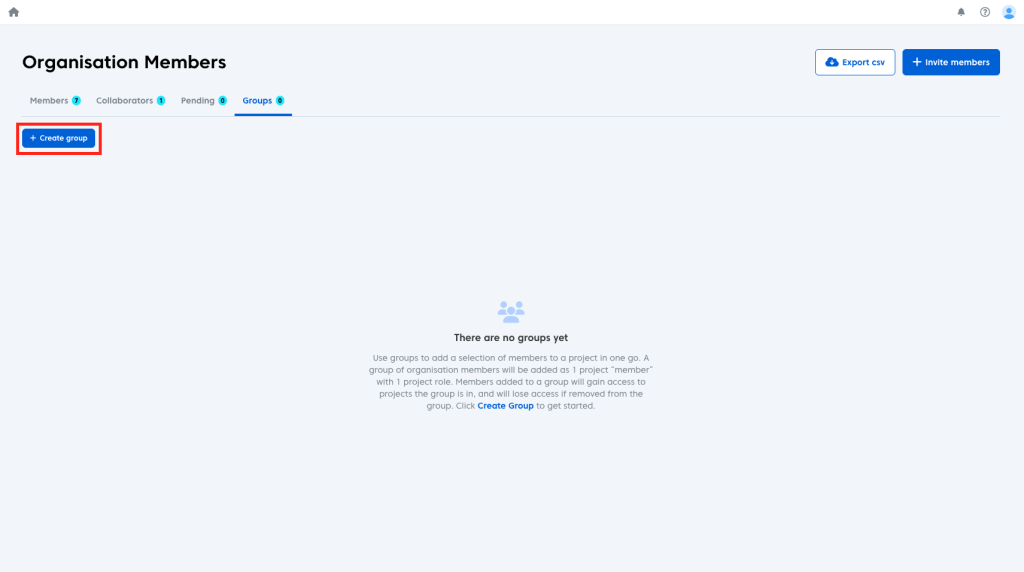 Groups can be created by the Owner of an organisation as well as users with the ‘Admin’ role. A group can contain both organisation users and contributors. To create your groups first: