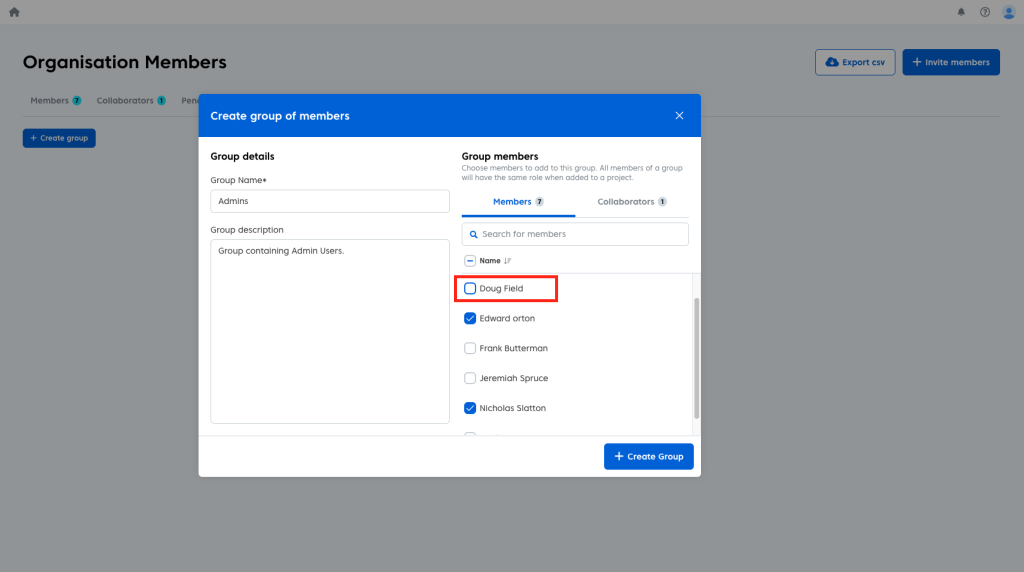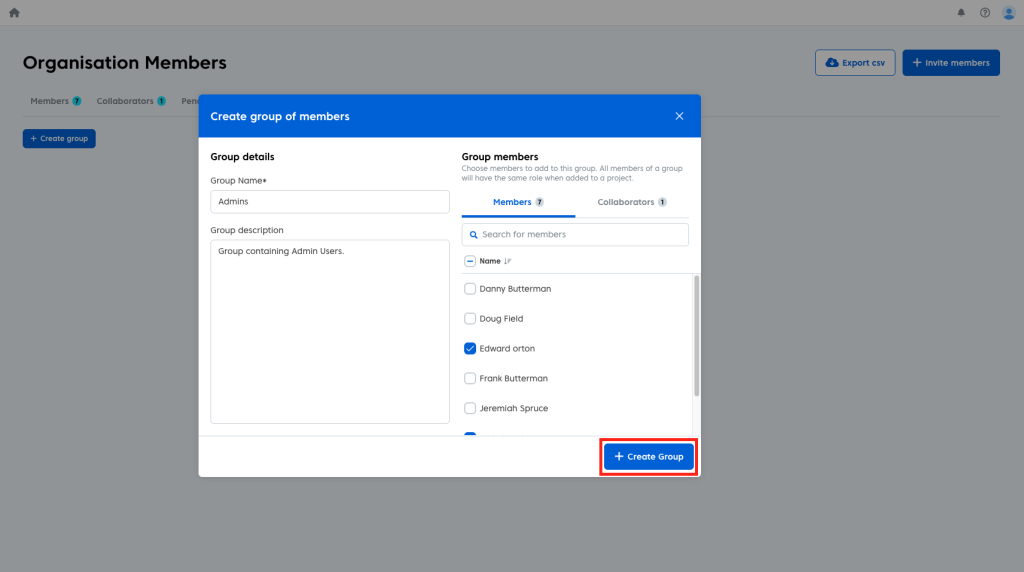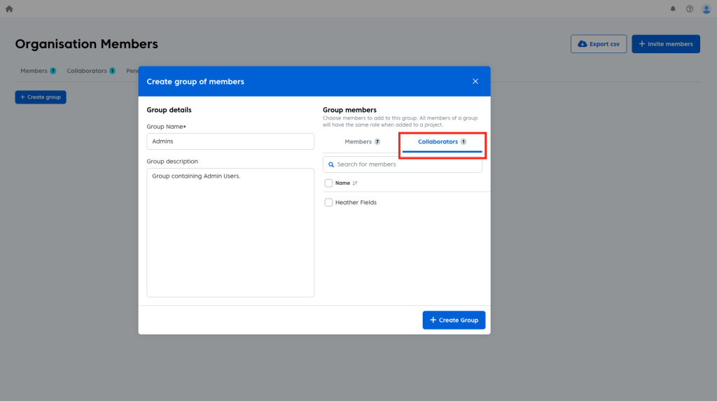 Within the group modal you will have the option to give your group a name, description and to add members or collaborators to the group. To add a user simply: