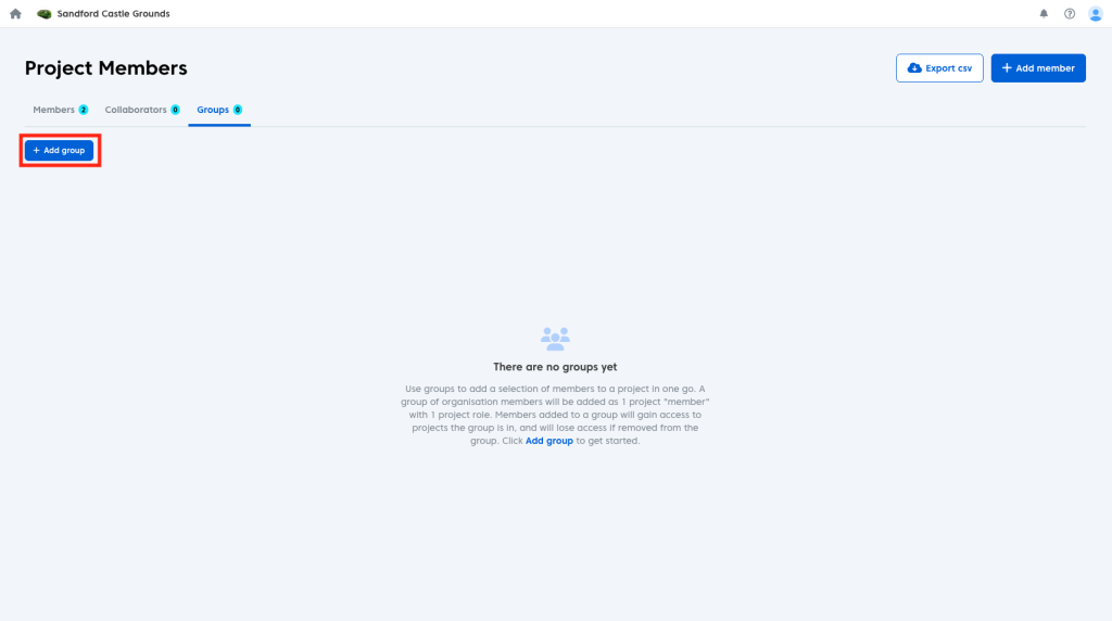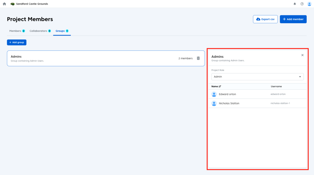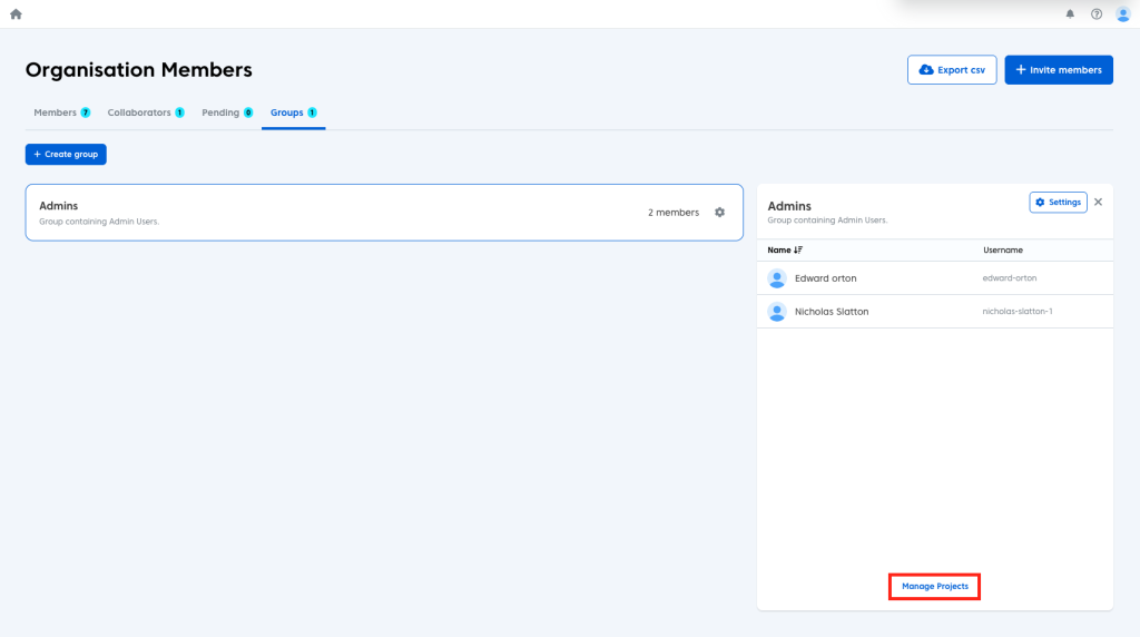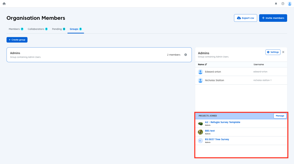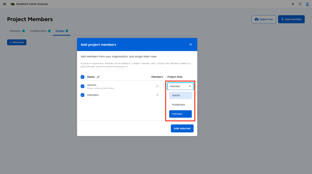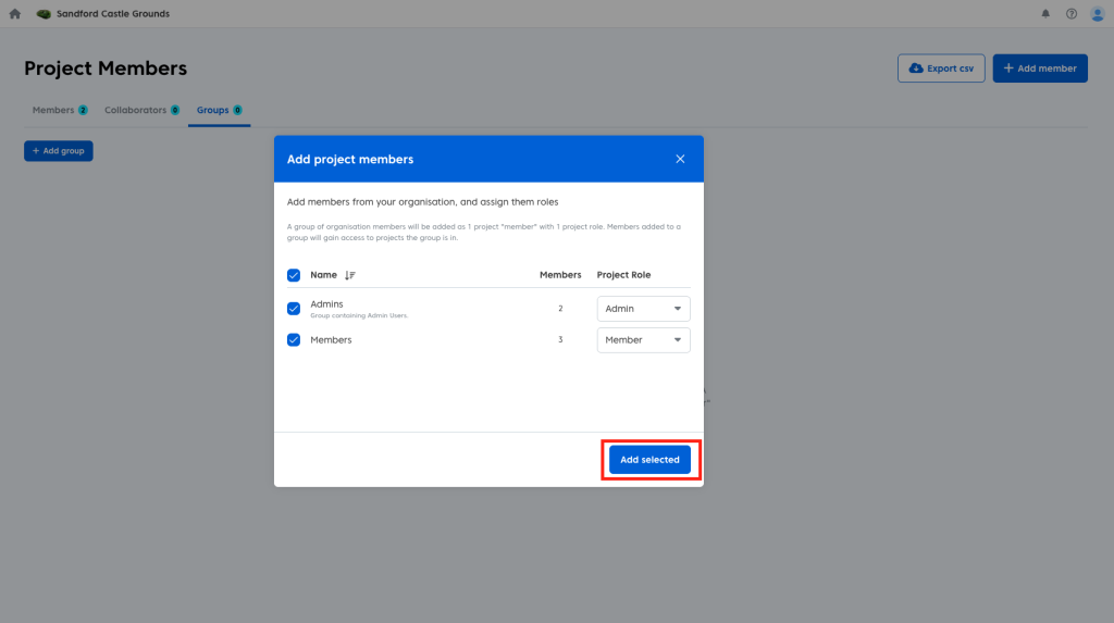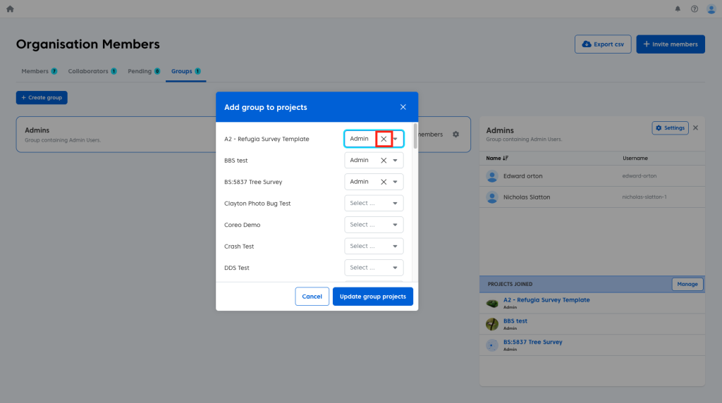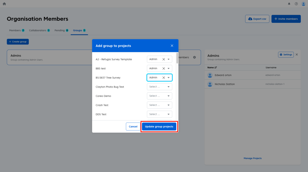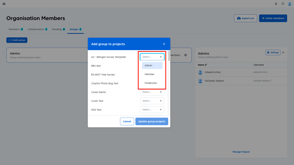 Note: Organisation Admins will always have admin rights regardless of the group project role.