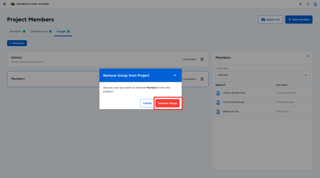 - Click the red ‘Remove Group’ button in the confirmation window.