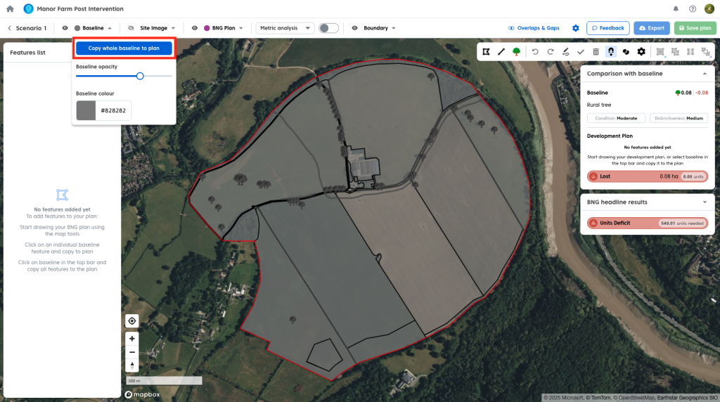 You can copy all baseline features into your plan in one go and then edit them to reflect your post-intervention design.
