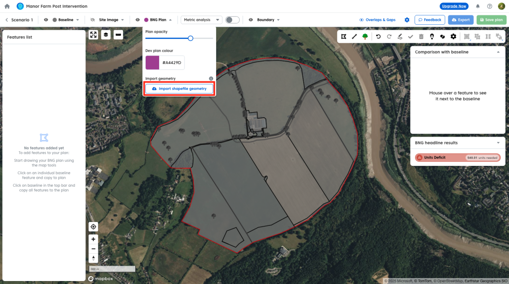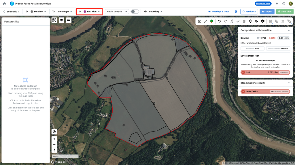 - Click the BNG plan dropdown in the plan tool bar.